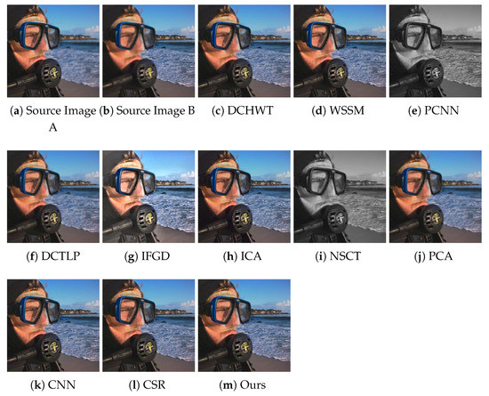 Figure 8 presents the fused images of the “Swimmer” image pair obtained by our algorithm and the compared methods. One can note that the results of the DCTLP method suffer from undesirable ringing artifacts: the fused image has lost most of the sharpness around the strong edges. Some blurred regions can be spotted in the results of the PCNN and NSCT methods. The fused image obtained by IFGD has lost some fine details due to extra brightness. The ghosting and ringing artifacts can be seen in the results of the PCA and NSCT algorithms as well. The ghosting artifact is also visible around the edges in the fused image produced by the ICA method. The fused images produced by WSSM, CNN, CSR, and our method are of good quality and are hard to visually differentiate. Similar observations can be made from the visual inspection of the results of ours and the compared methods on the “Cookie” image pair shown in Figure 9.