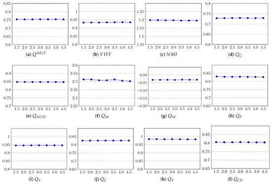 The parameter that is important in the computation of superpixels is k (Section 3.1), the desired number of approximately equally-sized superpixels. For an image with N pixels, the size of each superpixel is approximately pixels. In this experiment, we analyzed the impact of the number of superpixels on the performance of the proposed algorithm. We computed the fusion results with the proposed method using different values of k, and the results were evaluated using all 12 objective fusion quality metrics to get a general indicator. In particular, we tested the performance with , . From the results shown in Figure 10, one can note that most metrics show negligible or no change in the quality of the fused images; therefore, the impact of k on the fusion performance of our method is negligible. However, using a larger value of k certainly increases the execution time of the method due to the extra computation needed in computing the superpixels and their subsequent steps. The average execution times for different k are reported in Table 5. In our method, was set as the default.