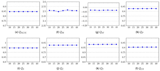 Impact of the number of superpixels k on the fusion quality of the proposed method. In all graphs, the x-axis represents k and the y-axis the quality score. The x-axis labels are coded as .