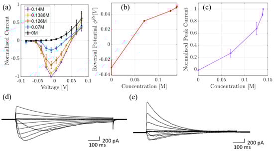 In Figure 8a, we plot the normalised current-voltage curves for the range of bath solutions. Overall we see good agreement between theory and data, but with two exceptions. NaChBac is a voltage-gated channel so that, at negative voltages, the number of open channels is reduced because the open probability decreases resulting in a smaller overall current [5,34]. Thus, at voltages below mV our current diverges from the experimental data, and hence serves as a prediction of the normalised current in a single open channel. This prediction is given by the dashed lines, which we note increase in magnitude as voltage becomes more negative because the gradient increases. Furthermore, when the bath solution contains no Na (black dashed curve) we observe poor agreement between theory and experiment and so highlight the curve with a dashed line. Finally, the inset curve shows the current closest to equilibrium.