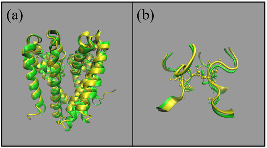 Comparison of NaChBac structures from the homology model (yellow) introduced in [8] and the Cryo-Em structure in green (6vx3.pdb) from [4]. (a) represents the whole pore and (b) is a snapshot of the (half) selectivity filter.