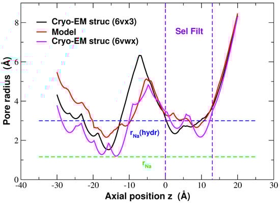 Comparison of average pore radius in the homology model structure (red) [8] and Cryo-EM structures 6vx3.pdb (black) and 6vwx.pdb (pink) [4]. The green and blue dashed lines denote the ionic Na and hydrated Na radii, respectively, and the purple dashed lines at Å highlight the selectivity filter region.