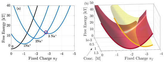 Free energy of the favoured states, plotted with . In (a) it is plotted vs. with 0.14M NaCl bulk solutions and in (b) vs. both and bulk concentration. In (a) the blue curves correspond to the occupied states of the pore, and black denotes the empty state. The purple circle highlights the location at which the two most favoured 2 and 3 ion states coincide, and we see that at there is a small energy barrier. As bulk concentration increases this energy barrier reduces and the purple circle would shift towards . This is further clarified by (b) which shows only the 2 and 3 ions states.