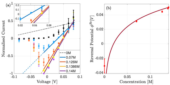The system is in equilibrium when the net current is zero, and this occurs when the applied voltage is equal to the reversal potential . This was measured experimentally and is compared to the theoretical current in (b). In the theory the reversal potential is calculated from,