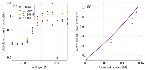 (a) Estimated open probability from the ratio of experimental to theoretical current. Below mV the open probability is close to zero indicating that the channels are closed. (b) Comparison of normalised theoretical current (solid line) and experimental (squares) data vs. bulk concentration, at mV of applied voltage.