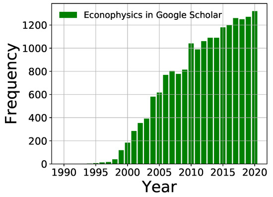 Histogram plot of yearwise numbers of entries containing the term econophysics against the corresponding year. The data are taken from Google Scholar (dated 31 December 2020). It may also be noted from Google Scholar that, while this 25-year old econophysics has today typical yearly citation frequency of order , more than 100-year old subjects, like astrophysics (Meghnad Saha published his thermal ionization equation for solar chromosphere in 1920), biophysics (Karl Pearson coined the term in his 1892 book ‘Grammar of Science’), and geophysics (Issac Newton explained planetary motion, origin of tides, etc., in ‘Principia Mathematica’, 1687), today (31 December 2020) have typical yearly citation frequencies of order , , and , respectively.
