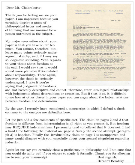 I tried to go through some of the isolated chapters or sections of these books, which I could understand, enjoyed, or liked most. Occasionally, I got excited and tried my own analysis, following them, on some interesting problems or discussions coming in my way. One such piece was a paper on ‘Indeterminism and Freedom’ by Bernard Berofsky of Columbia University, published in 1975, perhaps in Philosophical Quarterly. Among others, it also alluded to quantum physics in defending his thesis on freedom. I wrote a note detailing my criticisms and posted that to the author. The author, from the Department of Philosophy, Philosophy Hall, Columbia University in the City of New York, wrote to me the following letter on 17 June 1975 (see Figure 2):