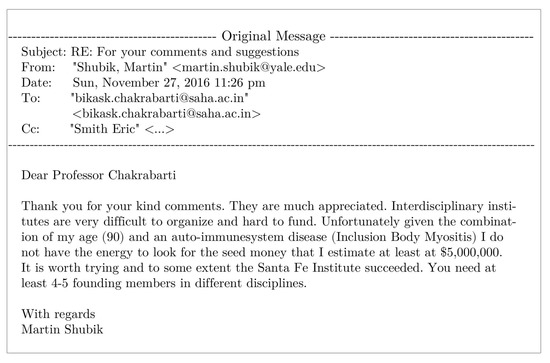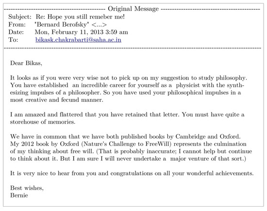 BKC: This is indeed very difficult to answer. To tell very frankly, the response so far is not very supportive or encouraging! Although, it must be mentioned, the term econophysics has now entered in dictionaries of economics (see, e.g., Reference [2]) and Encyclopedias of social science and philosophy (see, e.g., Reference [13]). That brings me to an interesting, rather recent, correspondence with my old philosopher ‘guide’ Bernard Berofsky in January 2013, after thirty-seven years! This was quite accidental, when I came across in my internet search a new book published by him. I contacted him (giving a link to my homepage) saying, “sorry, I could not follow your advice so far and had been very shy to contact you. Now that I have become sixty, I acquired sufficient courage and …”. Bernard immediately responded (see Figure 3) praising the development of econophysics due to the philosophical impulses of physicists.