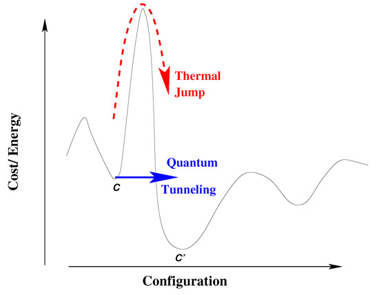 While optimizing the cost function of a computationally hard problem (like the minimum travel distance for the Traveling Salesman Problem (TSP)), one has to get out of a shallower local minimum, like the configuration C (travel route), to reach a deeper minimum C’. This requires jumps or tunneling, like fluctuations, in the dynamics. Classically, one has to jump over the energy or the cost barriers separating them, while quantum mechanically one can tunnel through the same. If the barrier is high enough, thermal jump becomes very difficult. However, if the barrier is narrow enough, quantum tunneling often becomes quite easy. Indeed, assuming the tall barrier to be of height N and width , one can estimate (see, e.g., Reference [42]) the tunneling probability through the barrier to be of order , where denotes the strength of quantum fluctuations (instead of the the classical escape probability of order , T denoting the thermal or classical fluctuation strength).