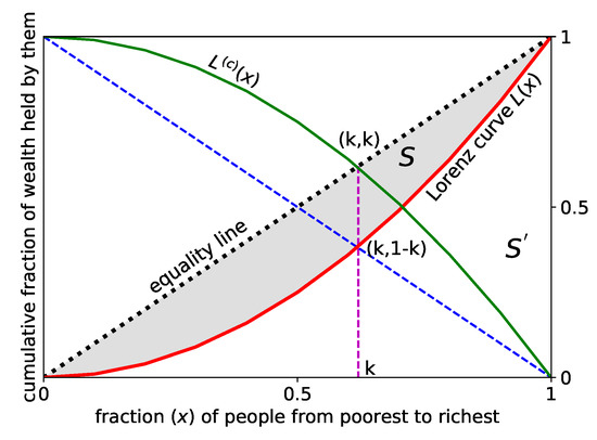It is based on the Lorenz curve or function [48] , giving the cumulative fraction of (total accumulated) income or wealth possessed by the fraction (x) of the population, when counted from the poorest to the richest (see Figure 5). If the income (wealth) of every one would be identical, then would be a straight line (diagonal) passing through the origin. This diagonal is called the equality line. The Gini coefficient (g) is given by the area between the Lorenz curve and the equality line (normalized by the area under the equality line: corresponds to equality and corresponds to extreme inequality.