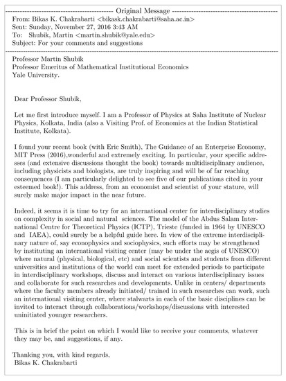 Mail from Bernard Berofsky of the Philosophy Department of Columbia University, in response to BKC’s surprise contact mail in 2013 (after almost thirty-seven years!), appreciating and identifying the development of econophysics as one due to the “physicist(s) with synthesizing impulses of a philosopher … (using) philosophical impulses in a most creative and fecund manner”.
