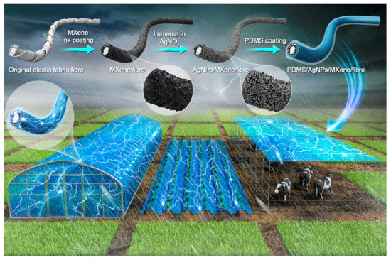 Jiang et al. [124] covered the surface of agricultural textiles with two special materials: conductive titanium carbide nanomaterials and non-conductive polydimethylsiloxane (a high molecular weight polymer). The polymer is waterproof and transfers electrons with rainwater in the environment. The titanium carbide sensor electrode not only has high conductivity, but also enables the surface polymer to capture electrons because of its high electronegativity. The intelligent agricultural textiles produced using this technology exploit the electron transfer and flow of rainwater to generate an electric current and continuously supply energy for intelligent agriculture (Figure 1). Based on the experimental data, a voltage of 7.7 V can be generated from 3 cm long yarn under a continuous force of 9.5 N. Therefore, with the aims of fabricating novel agricultural protection materials, preserving heat, shading, conserving soil and water, drainage and irrigation and the maintaining the seed cultivation functions of agricultural textiles, this technology can also continuously obtain energy from the agricultural environment to provide a driving force for smart agriculture and achieve the “passive real-time perception” of agricultural information.