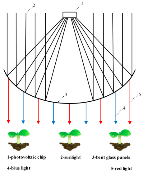 Liu et al. [125] combined concentrating photovoltaic technology with diffraction interferometry technology to design a new type of agricultural photovoltaic power generation system. The working principle of the system is shown in Figure 2. The curved glass panel is covered with a multi-layer dichroic interference film that transmits the red and blue light in sunlight to promote photosynthesis in crops and the remaining wavelengths of sunlight are reflected for photovoltaic power generation. The system is also equipped with dual tracking components to ensure that the reflected sunlight is always focused on the concentrating solar cells during the day and at different seasons of the year. Based on the experimental data, the average efficiency of the CPV system is 6.80%, a value that is higher than the traditional Sonneveld system (3%). The leaf surface temperature of the crops grown under the system is reduced by 2–4 °C and the water evaporation is reduced by 26%. The competition between photovoltaic power generation and crops has always been a problem in photovoltaic agriculture. The combination of concentrated photovoltaic technology and diffraction interference technology effectively establishes a balance between power generation and plant growth. In addition, this technology also reduces the evaporation of moisture from the farm, which is a crucial advantage for many countries (such as China and Israel) with scarce water resources.