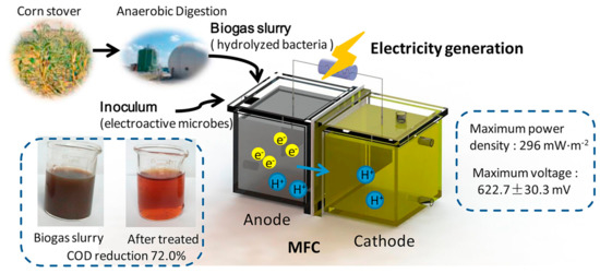 - Wang, F.; Zhang, D.; Shen, X.; Liu, W.; Yi, W.; Li, Z.; Liu, S. Synchronously Electricity Generation and Degradation of Biogas Slurry Using Microbial Fuel Cell. Renew. Energy 2019, 142, 158–166. [Google Scholar] [CrossRef]