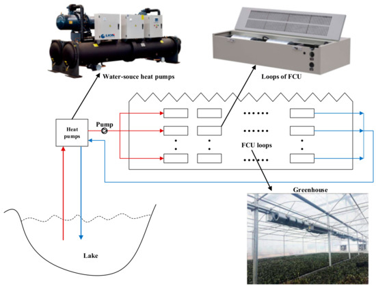 Schematic of a greenhouse with surface water source heat pump system.