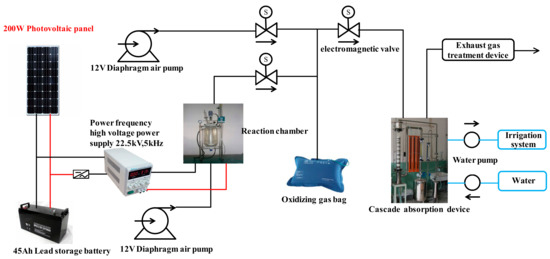 The solar low-temperature plasma nitrogen fixation system developed by the College of Information and Electrical Engineering, China Agricultural University is shown in Figure 5. It mainly consists of four parts: a plasma discharge reaction chamber, an oxygen mixing device, a nitrogen oxide absorption device and an exhaust gas treatment device. Solar energy is the energy source, water, air and calcium carbonate-containing rocks are used as raw materials to simulate the process of natural lightning discharge that produces calcium nitrate. Gaseous nitrogen oxides are generated through plasma discharge and liquid nitrogen fertilizer is generated through a specific absorption device before it is ultimately applied in agricultural production. This approach is very important to solve the problem traditional artificial nitrogen fixation that requires fossil energy consumption and emits large amounts of carbon dioxide. Yang et al. [127] also studied the effects of different frequency power supplies on the output of NOx using this system. High-frequency power supplies had the advantages of low energy consumption, a small size, high reaction efficiency and insensitivity to gas flow. The low-frequency power supply consumes approximately three times as much energy as a high-frequency system to produce the same amount of nitrogen oxide in water.