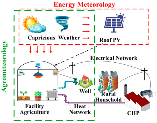 The micro-energy network of agricultural parks is a trend in the development of energy systems for agricultural parks, which promotes the development of facility agriculture, but it is vulnerable to meteorological influences and safety problems tend to occur under extreme weather conditions. Researchers at the College of Information and Electrical Engineering, China Agricultural University [129] have designed a method for analyzing the safety of micro-energy networks in agricultural parks, because the light environment and thermal environment of facilities suitable for cucumber growth in greenhouse require energy systems to provide electricity and heat for regulation. This method quantifies the effects of agricultural meteorology and energy meteorology and analyses the effects of weather changes, the photovoltaic panel layout and grid connection of facility agriculture on the safe operation of micro-energy networks in agricultural parks. The contribution of this article is the consideration of the interaction between meteorological energy and agricultural meteorology. As shown in Figure 7, the spatial coupling model and energy coupling model of the energy system and the agricultural system were established.