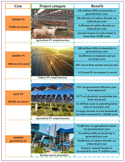 Here we introduce four representative projects based on agriculture-PV complementary or fishery-PV complementary. Data on costs and benefits of each project is shown in Figure 9, where the ecological and economic value of each project is displayed. Project 1 is located in Kubuqi Desert, the seventh largest desert in China. The project adopts a five-in-one compound ecological solar sand control model of “desert control + grass planting + farming + power generation + poverty alleviation” [132,133]. Project 2 is located in Hefu Town, Nanxun District, Huzhou City, Zhejiang Province. The project combines the photovoltaic power station with the local traditional mulberry fishpond, integrating aerial power generation, underwater aquaculture and water sight-seeing [134,135]. Project 3 is located in Binhe New District, Yinchuan City, Ningxia Province. The project is responsible for the ecological control of desertified land, plants local characteristic industry wolfberry and builds a photovoltaic power generation project above the wolfberry plants [136,137]. Project 4 is a demonstration project of agriculture and forestry biomass power generation in Xiangyang City, Hubei Province. It can generate biomass ash while using agricultural and forestry wastes to generate electricity, which can be used as agricultural organic fertilizer to improve the soil environment [138,139].
