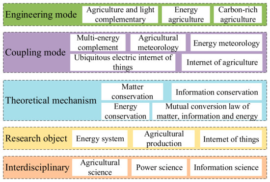 Facility agriculture science, electric power science and information science intersect to form the theory of the park-level agricultural energy internet. The sustainable coordinated development of energy systems and agricultural production is the main line and the disturbances in agrometeorology and energy meteorology are considered. Based on the basic characteristics of material flow, energy flow and information flow, the coordination of agricultural material, energy and sensor information is achieved. The coupling of information and energy is the essential feature of the energy internet and the coupling of information, material and energy is the essential characteristic of park-level agricultural energy internet. The theoretical system of the park-level agricultural energy internet is shown in Figure 11 [141].