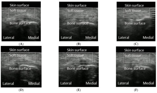 Examples of B-mode ultrasound images obtained from the first metatarsal head of a participant after different walking conditions. (A) 10 min duration at 1.8 mph. (B) 10 min duration at 3.6 mph. (C) 10 min duration at 5.4 mph. (D) 20 min duration at 1.8 mph. (E) 20 min duration at 3.6 mph. (F) 20 min duration at 5.4 mph. Each image shows the region of interest (ROI, from the surface of the skin to the surface of the first metatarsal head with a width of 100 pixels) and the medial and lateral sides of the participant.