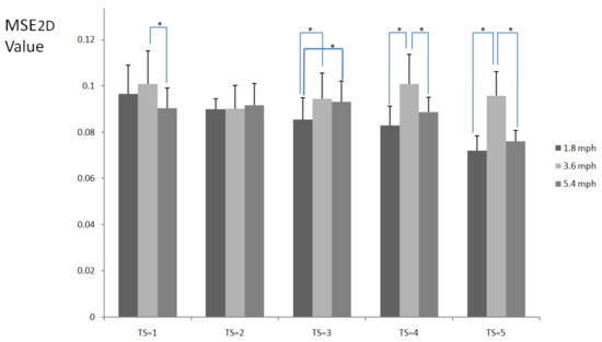 MSE2D values of plantar ultrasound images after walking at 1.8, 3.6, and 5.4 mph for 20 min at the time scales 1, 2, 3, 4, and 5. Data are presented as mean + standard deviation. The symbol * indicates p < 0.05.