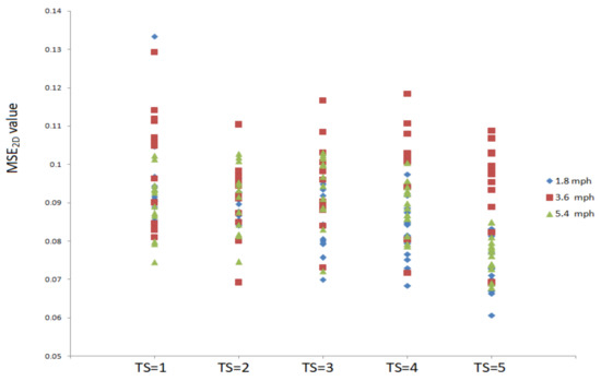 All participants’ MSE2D values of plantar ultrasound images after walking at 1.8, 3.6, and 5.4 mph for 20 min at the time scales 1, 2, 3, 4, and 5.