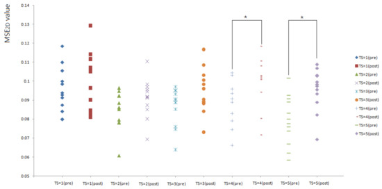 Figure 4 shows the comparison of MSE2D values of plantar ultrasound images before and after walking at 3.6 mph. In this study, only MSE2D values of plantar ultrasound image before and after walking at 3.6 mph for 20 min showed significant differences at the time scales 4 and 5 (p < 0.05). After walking at 3.6 mph for 20 min, plantar soft tissue significantly exhibited higher complexity.