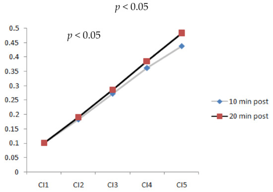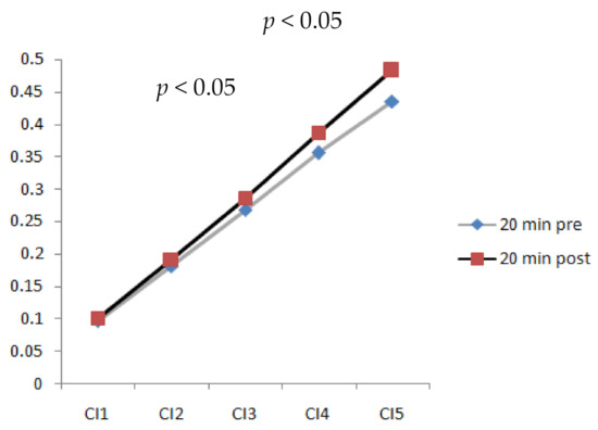 The results indicated that a longer walking duration (20 min) significantly increased the complexity index (CI) of plantar soft tissues (p < 0.05). Figure 5 shows CI values at different time scales after walking at 3.6 mph for 20 min. It shows a trend wherein the complexity index increased as the time scales increased. The values of CI4 (complexity index at time scale 4) and CI5 (complexity index at time scale 5) indicated a significant difference (p < 0.05). Time scales 4 and 5 were able to detect the differences in plantar ultrasound images before and after walking.
