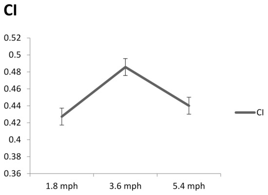 The baseline demographic data were reported with descriptive statistics. The 3 × 2 two-way analysis of variance (ANOVA) with repeated measures was used to compare the CI between the three speeds (1.8, 3.6, and 5.4 mph) and two durations (10 and 20 min) and the interaction between speeds and durations. A one-way ANOVA with Fisher’s least significant difference correction was used for pairwise comparisons of the CI between three walking speeds (1.8, 3.6, and 5.4 mph) under each walking duration (10 and 20 min). The correction was used to overcome multiple comparison issues in this repeated measures study. The significance level was set to 0.05. All statistical tests were performed using SPSS 26 (IBM, Somers, NY, USA). The CI was calculated by the MATLAB R2019b (MathWorks, Inc., Natick, MA, USA).