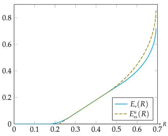 It is interesting to relate this to the expurgated bound of the FR code in the SW model, which is given by (15). Comparing and analytically is rather difficult. Thus, we examined these two exponent functions numerically. Consider the case of a double binary source with alphabets , and joint probabilities given by , , , and . We already mentioned before, that in the special case of , the rate function is given by the threshold , hence we choose in order to have a fair comparison. Graphs of the functions and are presented in Figure 1.