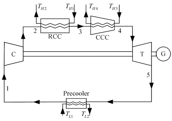 The heat exchangers’ heat conductance is the product of the heat transfer coefficient and the heat transfer area. The heat exchangers’ heat conductance values in the RCC, CCC, and precooler are , and , the heat transfer units’ numbers are , and , and the effectiveness values are , and , respectively: