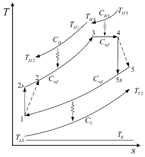 The heat leakages between the heat source and the environment [127,128] are neglected. Therefore, the and are: