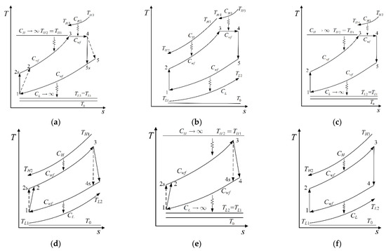 - When and , Equations (30)–(34) can be simplified into the performance indicators of the simple endoreversible BCY coupled to VTHRs [78], whose diagram is shown in Figure 3f: