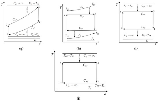 Figure 3. Diagrams of (a) irreversible simple BCY with an IHP and coupled to CTHRs; (b) endoreversible simple BCY with an IHP and coupled to VTHRs; (c) endoreversible simple BCY with an IHP and coupled to CTHRs; (d) simple irreversi-ble BCY coupled to VTHRs; (e) simple irreversible BCY coupled to CTHRs; (f) simple endoreversible BCY coupled to VTHRs; (g) simple endoreversible BCY coupled to CTHRs; (h) endoreversible Carnot cycle coupled to VTHRs; (i) endoreversible Carnot cycle coupled to CTHRs; (j) endoreversible Novikov cycle coupled to CTHRs. - When , Equations (30)–(34) can be respectively simplified into the performance indicators of the endoreversible simple BCY with an IHP and coupled to VTHRs [99], whose diagram is shown in Figure 3b: