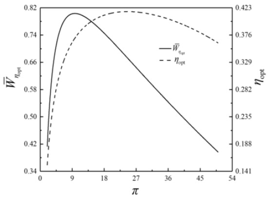 - Through comparison with the results in Refs [11,12,13,14,59,76,77,78,79,99], it is found that the results of this paper are consistent with those in Refs [11,12,13,14,59,76,77,78,79,99], which further illustrates the accuracy of the model established in this paper. In particular, when the powers in Equations (58), (62), (66), (70), and (74) take the maximum values, namely , the efficiencies at the maximum power point, Equations (59), (63), (67), (71), and (75) are , which was derived in Refs. [10,11,12] by Moutier [10], Novikov [11], and Curzon and Ahlborn [12]. One can see that the results of this paper include the Novikov–Curzon–Ahlborn efficiency.