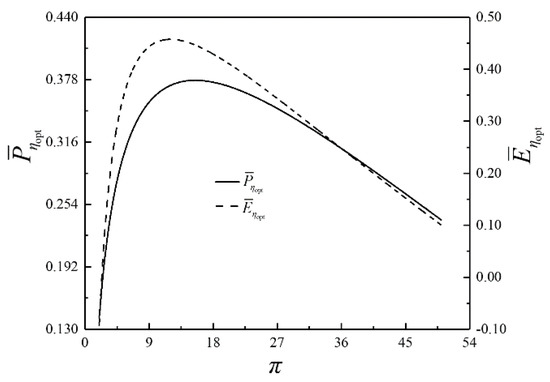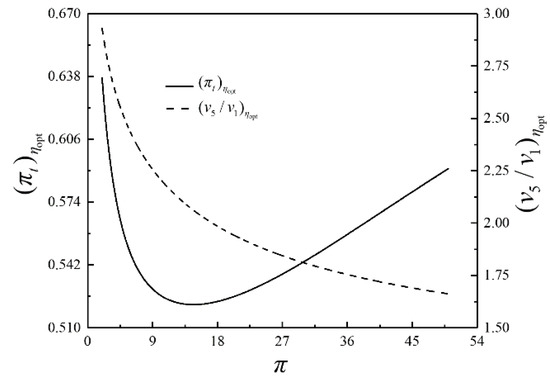 The optimization results of four performance indicators are similar. The optimization results with as the performance indicator will be mainly discussed herein, while the results with , and as the performance indicators are briefly discussed. The relationships of the optimal thermal efficiency () and the corresponding dimensionless power output () versus are shown in Figure 9. The relationships of the corresponding dimensionless power density () and the corresponding dimensionless ecological function () versus are demonstrated in Figure 10. As shown in Figure 9 and Figure 10, , , and first rise and then drops as rises, which indicates a parabolic relationship with the downward opening. The corresponding isothermal pressure drop ratio () and dimensionless maximum specific volume () versus are shown in Figure 11. decreases and then increases as increases. It indicates that there is a that maximizes the degree of isothermal heating in the cycle. decreases as increases. The relationships of the HCDs (, and ) versus are shown in Figure 12. As increases, decreases, increases rapidly and then slowly, and decreases first and then increases gradually.