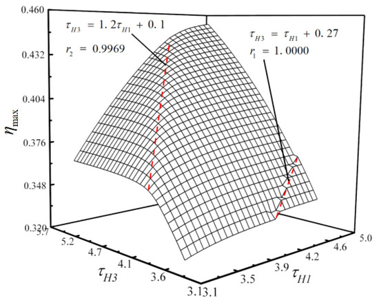 With as the performance indicator, the influences of the temperature ratios on the optimization results are discussed. The relationship of the maximum thermal efficiency () versus and is shown in Figure 13. According to Figure 12, the surface is divided into three parts by line (the correlation coefficient is ) and (the correlation coefficient is ). has little influence on . When , increases as increases; when , has little impact on . It is recommended to magnify .