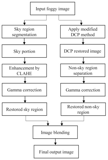 The major focal point of this method is to surpass the limitation of the dark channel prior algorithm within a lower computational time while defogging a foggy image. Therefore, a method was proposed where sky and non-sky part are restored separately. As a result, the sky part is restored without having its color distorted. The original color of the sky can be preserved through this approach. Then the restored image is enhanced to have a good visual perception. The flowchart of the proposed framework is shown in Figure 2.