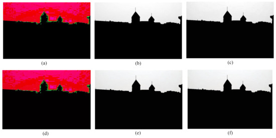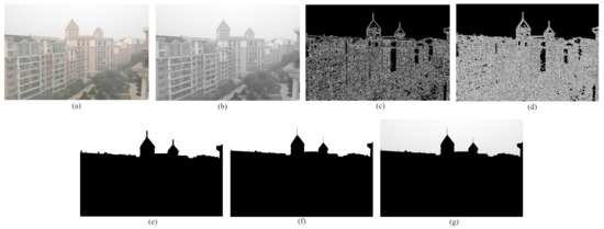 Step 6: The obtained binary mask is used to isolate the sky region from the non-sky part of the original image. To do this, an AND operation is performed between the binary mask and the input foggy image. The resultant sky region is displayed in Figure 4g.