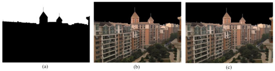 The invert of binary mask discussed in Section 4.1 has the non-sky part as foreground and the sky part as background. The inverted binary mask is shown in Figure 8a. This mask is used to detach the non-sky part and sky part from the DCP restored image following the same procedure as mentioned in Section 4.1. Here, the AND operation is performed between the inverted binary mask and the DCP restored image. The obtained non-sky region is exhibited in Figure 8b.