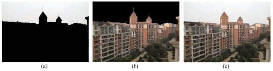 Non-sky region segmentation and enhancement process. (a) Inverted binary mask, (b) segmented non-sky region from the DCP restored image, (c) restored non-sky region after gamma correction.