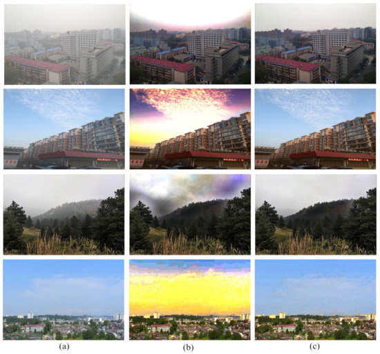- Wang, W.; Yuan, X.; Wu, X.; Liu, Y. Dehazing for images with large sky region. Neurocomputing 2017, 238, 365–376. [Google Scholar] [CrossRef]