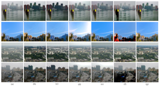 Comparison among different defogging algorithms using real world images. (a) foggy images, (b) G. Wang et al.’s method, (c) W. Wang et al.’s method, (d) A. Sabir et al.’s method 1, (e) A. Sabir et al.’s method 2, (f) S. Salazar-Colores et al.’s method, and (g) proposed method.