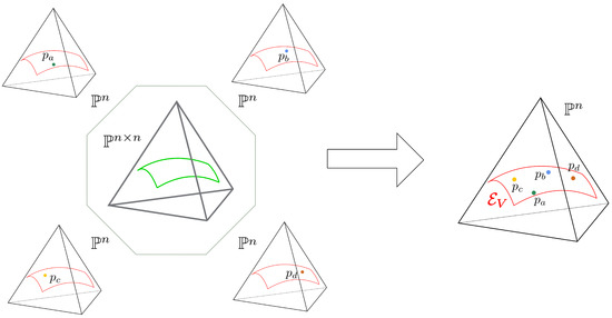 Each conditional model lies inside a face of the -dimensional simplex, corresponding to the ambient space for the joint distribution parametrized by . Since the conditional models are defined over the same sample space and have the same sufficient statistics determined by V, we can identify them with a single exponential family embedded in , as depicted in Figure 1.