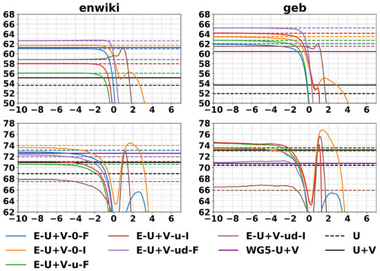 Word similarities expressed in Spearman correlation × 100 (top) and word analogies accuracies (bottom) for different values of . The left column reports experiments on enwiki, while the right column reports experiments on geb. U, U+V, and WG5-U+V are the GloVe vectors of size 300 described in the text, centered and normalized. Figure from [30].