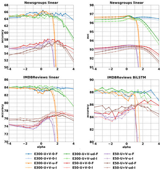 Accuracy and AUC on 20 Newsgroups and IMDB Reviews datasets for varying . The metrics I and F refer to the normalization of the embeddings before training. Figure from [30].