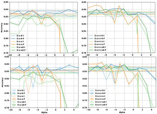 Accuracy of the decomposable attention model over the sentence entailment task without projection matrix. (top row) Test accuracies at best validation point during training; (bottom row) test accuracies averaged over the last 10 epochs of training. (Left column) U embeddings, (right column) U+V embeddings. The vectors have been normalized either with the Fisher information matrix (F) or with the identity matrix (I). The limit embeddings are represented by the dashed lines of the corresponding color.
