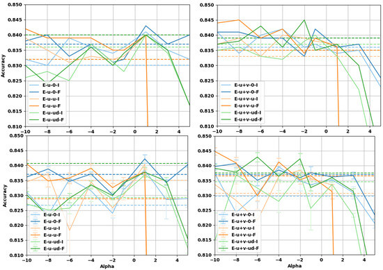 The embeddings in Equation (5) will be denoted with E in all the figures and tables from this section, while the limit embeddings in Equation (12) will be denoted with LE. Embeddings have been normalized either with the Fisher information matrix (F) or the identity matrix (I). Similarly, scalar products will be computed either with the Fisher information matrix (F) or the identity matrix (I). In the following, in case both inner product and normalization are used in the same experiment, they will be computed with respect to the same metric (either F or I). For the reference distribution needed for the computation of the -embeddings, we have chosen the uniform distribution (0), the unigram distribution of the model (u) obtained by marginalization of the joint distribution learned by the model