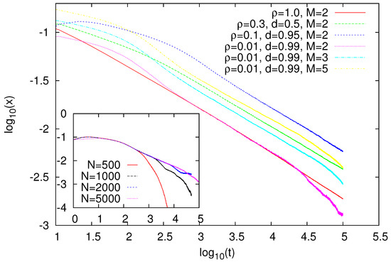 For and , we also calculated the time dependence of x (Figure 7). In the absence of migration (), we observed a power-law-like decay of x, but some bending of our data suggested that estimated decay may not be truly asymptotic. Slower decay, perhaps logarithmically slow, would actually be consistent with the coarsening of the Ising model on diluted lattices [35]. Leaving aside the correct asymptotic form of the decay of x, the coarsening that took place in our model for was an expected feature, assuming some analogy to the Ising model, with which the naming game seems to have some similarities. Indeed, above the site-percolation threshold ( [36,37]), the Ising model was expected to ferromagnetically order at a sufficiently low temperature with the accompanying power-law coarsening [38,39], and we expect similar behaviour in the naming game. Below such a threshold (), our agents were located in finite clusters, which rather quickly became monolingual due to the naming game.