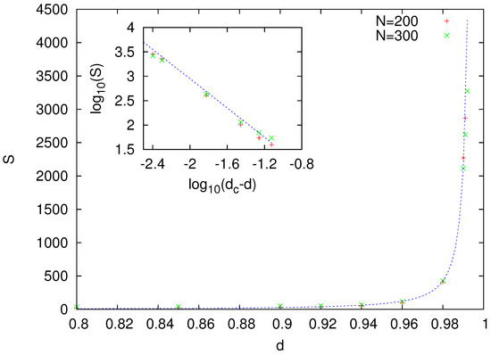 The size of these clusters seemed to increase with migration rate d. Calculation of the average size of such clusters S suggests that S may diverge at value , which is close to but smaller than (Figure 3).